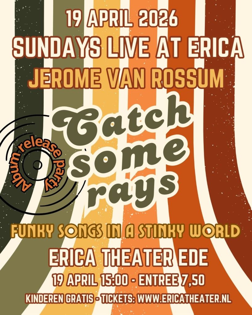 Jeroen zal op zondagmiddag 19 april nieuwe nummers spelen van het net uitgebrachte album Catch Some Rays, een collectie van originele jazzy en funky nummers met wereld-kritische lading en een humoristische knipoog. Hij voelt onze maatschappij aan de tand met Ignorance Rules the World, hekelt vastgeroeste ideeën over relaties (She’s got a Lover on the Side), zingt over het minst mooie meisje van de klas (Oh Mary Lou) en hoe we te veel hooi op onze vork nemen (I got a lot on my Mind). Jeroen concludeert dat hoewel Money Makes the World Go ‘Round, Love Keeps it Together! Pak die liefde in een straal zonlicht in het Erica Theater bij de klanken van het Catch Some Rays album!
